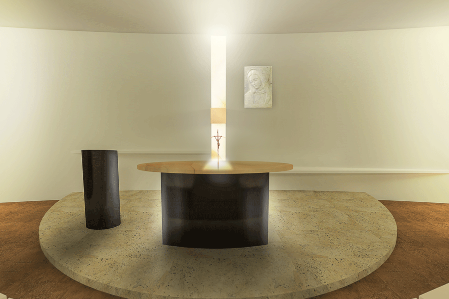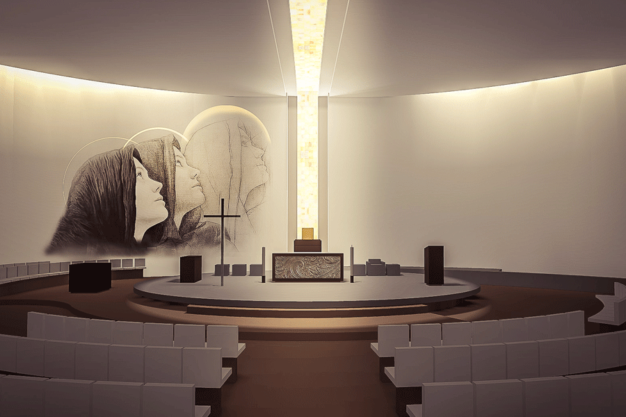 La Anunciación es la advocación de este templo, y por lo mismo el Espíritu Santo se representa con un vitral que atraviesa su forma cilíndrica por completo, iluminando su interior.